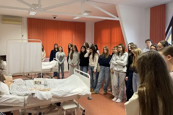 Az ápoló szakirány gyakorlati elemeit Dr. Barth Anita adjunktus mutatta be a Skill-laborban, különös hangsúlyt fektetve az ápolói kompetenciák mindennapi alkalmazására és a betegellátás komplex jellegére. Kása Erzsébet mesteroktató a demonstrációs termekben az ápoló szakirányhoz kapcsolódó eszközöket és felszereléseket ismertette, miközben a diákok aktívan figyeltek, kérdeztek, és közvetlenül tapasztalhatták meg a gyakorlati kompetenciák alkalmazását. A gimnázium oktatójának kérésére bemutatta a vérvétel és a branül behelyezés folyamatát, lehetőséget adva a tanulóknak, hogy testközelből lássák az ápolói munka precizitását és a biztonságos eljárások fontosságát.