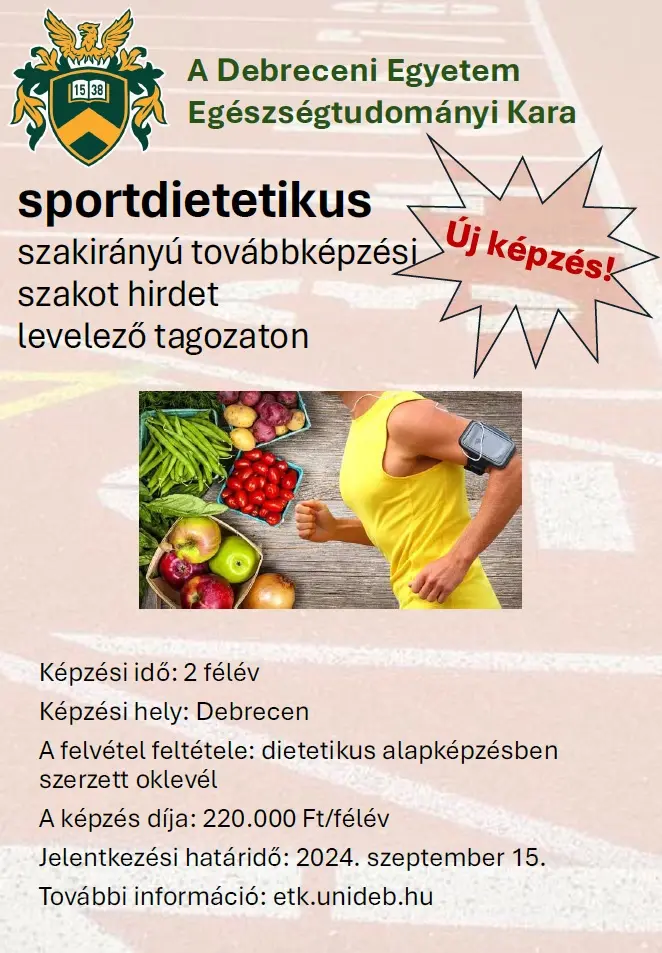 A képzés célja, hogy kompetenciákkal, képességekkel rendelkező szakembereket képezzünk. A képzést azoknak ajánljuk, akik érdeklődnek a sporttáplálkozás, a dietetika, a táplálkozástudomány és a sportágak iránt.