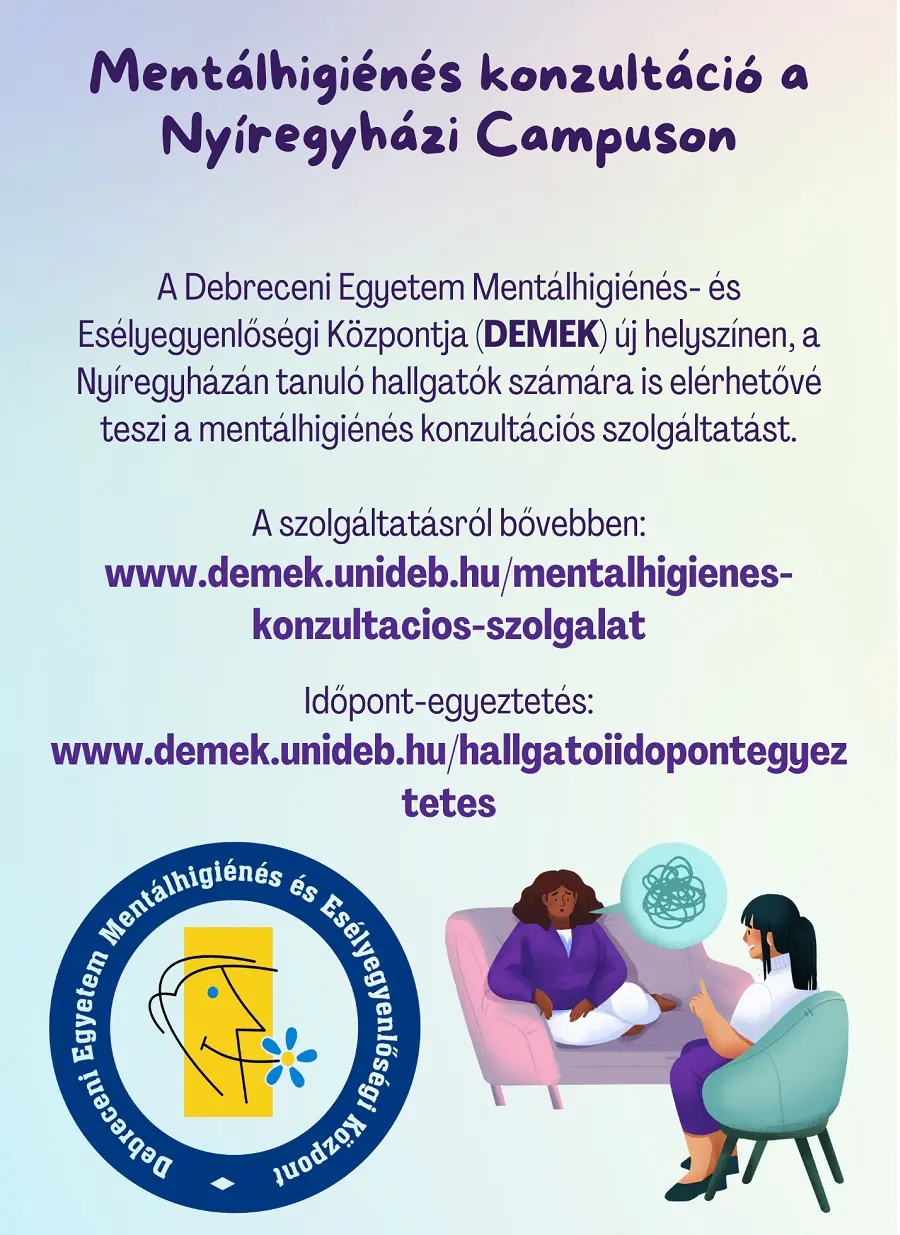 A Debreceni Egyetem Mentálhigiénés és Esélyegyenlőségi Központja (DEMEK) várja azon egyetemi hallgatókat, akik életvezetési, lelki gondjaiban segítséget igényelnek. Az 5 ingyenes személyes konzultáció során tapasztalt szakemberek várják a hallgatókat Nyíregyházán.