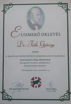 A Magyar Egészségügy Szakdolgozói Kamara Szabolcs-Szatmár-Bereg Vármegyei Területi Elnöksége a 2024. november 13-án megrendezett Szabolcs-Szatmár-Bereg Vármegyei Egészségügyi Szakdolgozók XIX. Tudományos Napján "Semmelweis Nap alkalmából kimagasló szakmai munkájáért elismerésben" részesítette a Sürgősségi és Oxiológiai Tanszékről Dr. Tóth György adjunktus kollégánkat. Az elismeréshez gratulálunk!